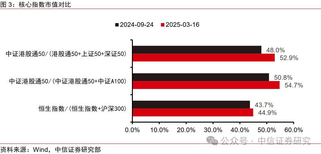 截至2025年3月16日,我们计算,1)如果以恒生指数/(恒生指数+沪深300)来看,大致市值占比为45%;2)如果以中证港股通50/(中证港股通50+中证A100)来看,大致市值占比为55%;3)如果以中证港股通50/(中证港股通50+上证50+深证50)来看,大概市值占比为53%。