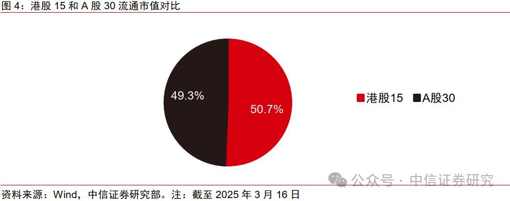 我们此前分别在《A股市场2025年春季投资策略—中国核心资产的春天》(20250302)和《A股策略聚焦20250309—牛市的烦恼》中提出了“A股新核心资产30组合”和“港股新核心资产15组合”。A股新核心资产30包含新科技赛道公司14家+传统核心资产16家;港股新核心资产15包含了互联网、创新药、硬科技、智能车四大新经济赛道的公司。以2025年3月16日流通市值占比计算,港股15/(A股30+港股15)约为51%。