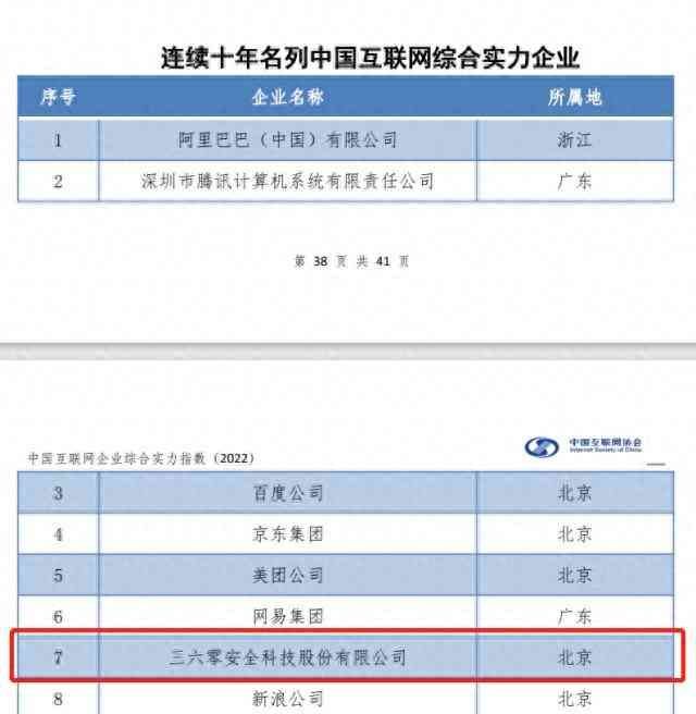 11月2日,中国互联网协会发布《中国互联网企业综合指数(2022)》,揭晓“2022年中国互联网综合实力企业”百强名单,腾讯、阿里巴巴、三六零(股票代码:601360.SH,以下简称360)、新浪等企业上榜。榜单显示,360同时上榜“2022 年中国互联网综合实力企业“、”2022 年中国互联网数据安全服务企业“,并作为唯一的数字化安全企业,连续十年跻身”中国互联网综合实力企业“。