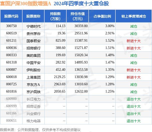 富国沪深300指数增强A为指数型-股票基金,根据最新一期基金季报显示,该基金资产配置:股票占净值比93.65%,无债券类资产,现金占净值比6.79%。基金十大重仓股如下: