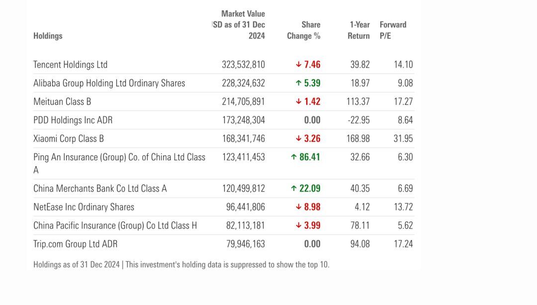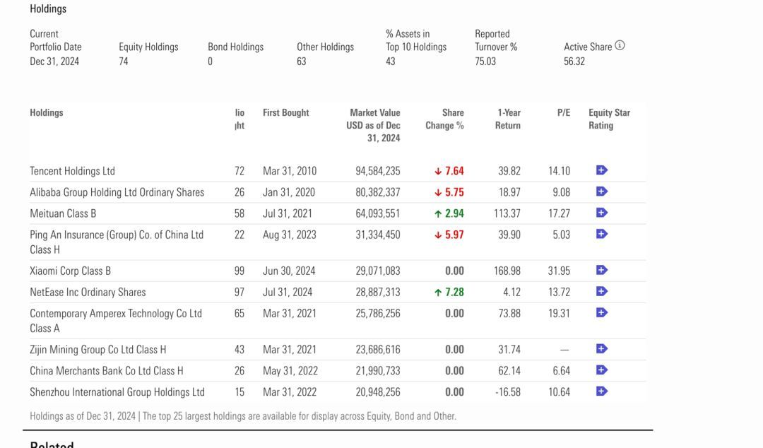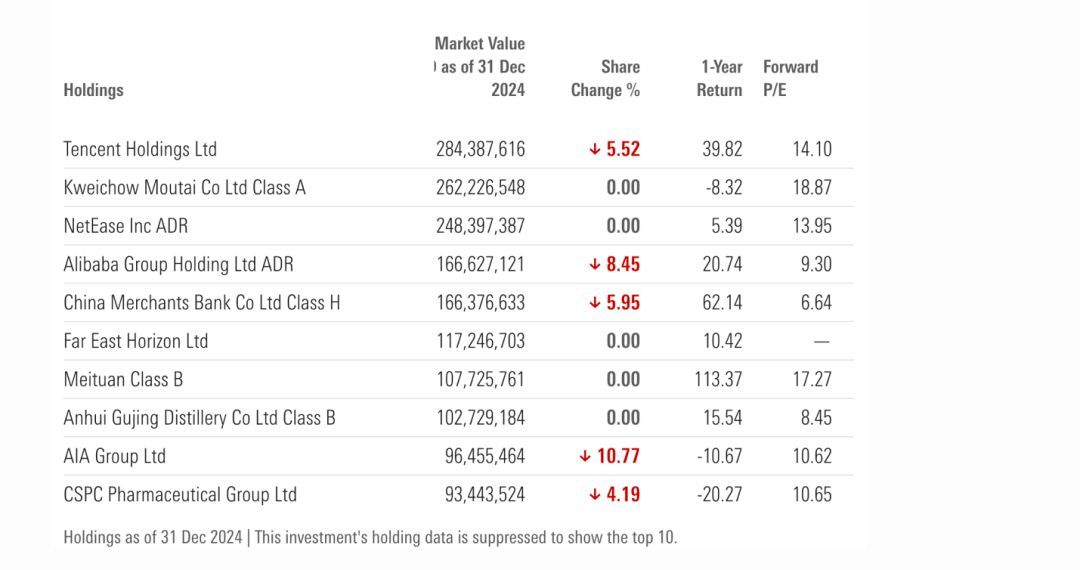 截至2024年底,基金前十大重仓股为腾讯控股、阿里巴巴、美团、中国平安、小米集团、网易、宁德时代、紫金矿业、招商银行、申洲国际。2024年12月,基金加仓网易7.28%,加仓美团2.94%;同期,基金减持网易7.64%,减持阿里巴巴5.75%,减持中国平安5.97%。