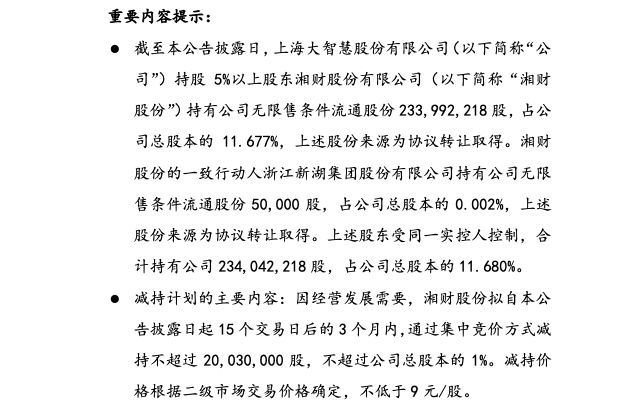 大智慧(601519)2月14日晚间公告,第二大股东湘财股份拟减持公司股份不超过2003万股,不超过公司总股本的1%,减持价格不低于9元/股。