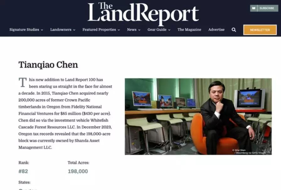 据《土地报告》称,陈天桥斥资8500万美元,从美国住宅抵押贷供公司购买了俄勒冈州近8亿平方米的林地;2018年,他又以3900万美元买下了曼哈顿东69街的范德·比尔特大厦;2021年,他以2500万美元购入了洛杉矶郊区的西利·穆德庄园。如今,他已经成为了美国排名第82位的大地主,也是美国第二大外籍土地拥有者。据估算,陈天桥名下的土地面积相当于整个纽约市和4.5个华盛顿,甚至比北京五环内的面积还要大,能容纳11万个足球场,价值约6亿人民币。