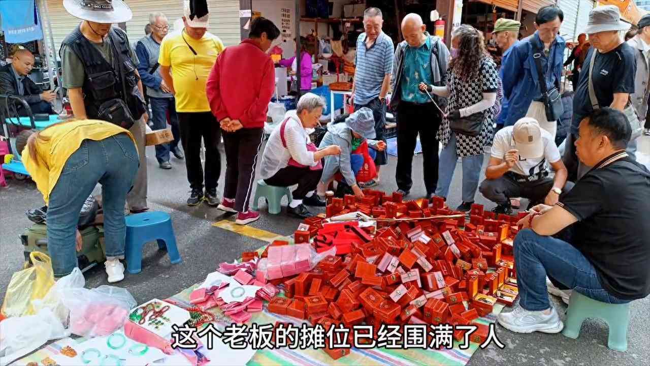 从这个大门进去就到赶集的地方,进大门这个通道人多一些。现在是早上10点多,这个老板的摊位已经围满了人,样样30块。小盒子看上去还挺别致,傣味凉拌菜的摊位前带孩子的宝妈正在夹着菜,清清爽爽,看着还挺好吃。市场还挺大的,但人不是特别多。铺面旁边有很多通道,卖各种杂货、旧货、挂件的都有,看得眼花缭乱,难怪叫淘宝集市。