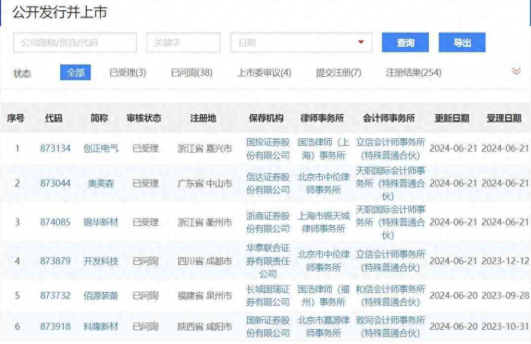 截至目前,北交所已受理企业3家,已问询38家,上市委审议4家,提交注册7家。
