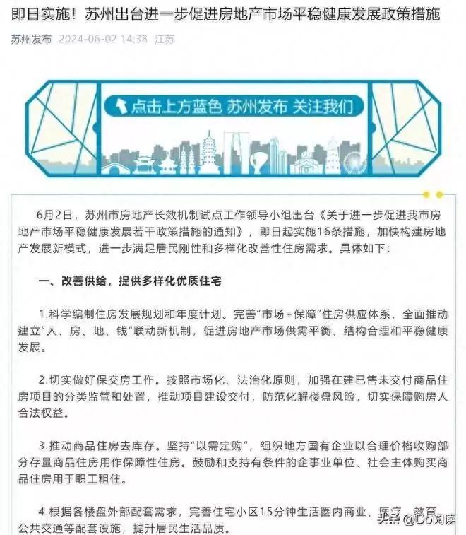 苏州市近期公布了一系列的楼市新政,涵盖了限购的全面放开、买房即可落户以及对于首付比例的下调等。其中,苏州市房地产长效机制试点工作领导小组出台了16条措施,包括不再审核购房资格,降低首付比例和利率下限,优化公积金贷款政策等。