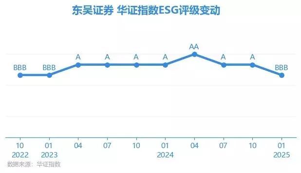 日前,华证指数公布了新一期(2025年1月31日)的ESG评级结果,东吴证券(601555.SH)获得BBB评级(华证指数评级为C起至AAA九档,C为最低档,AAA为其最高一级评级/AA为其第二档),上一期(2024年10月31日)ESG评级为A。本期ESG评级在54家资本市场行业A股上市公司中排名第31(上一期排名第10)。