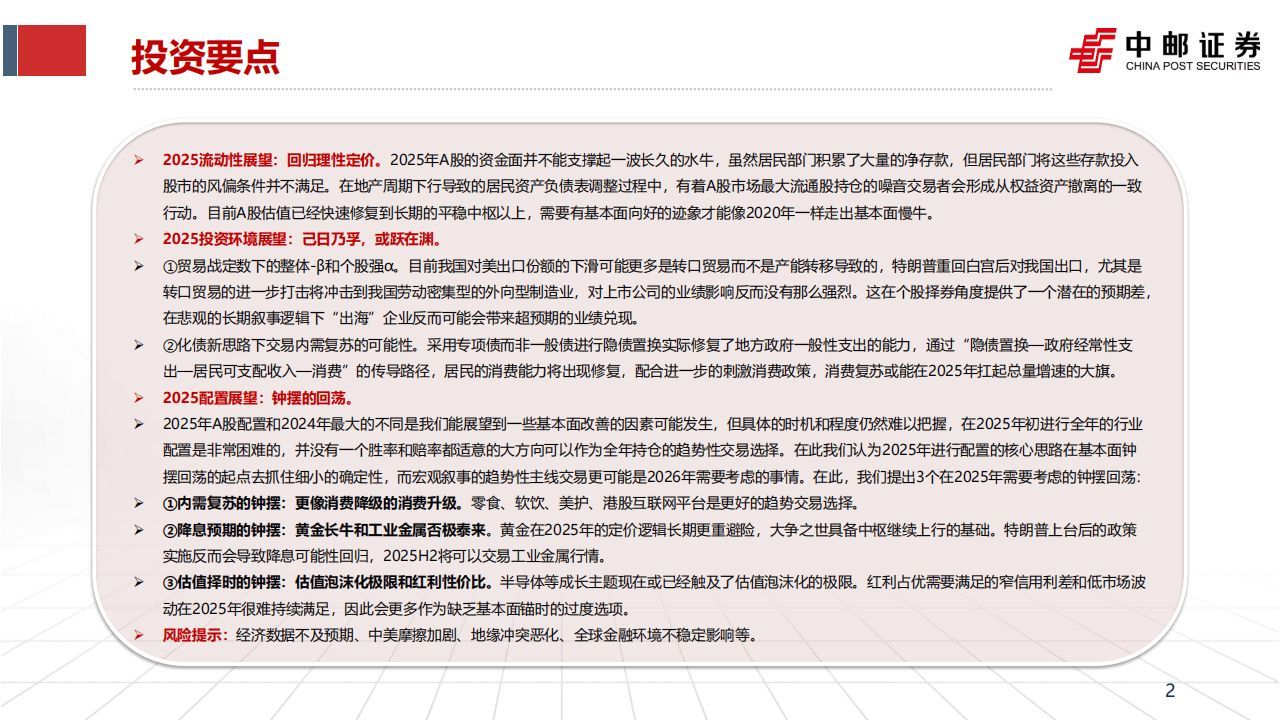 中邮证券发布的《钟摆的回荡--2025 年 A 股投资策略》报告,对 2025 年 A 股市场的流动性、投资环境和配置方向进行了全面分析与展望。