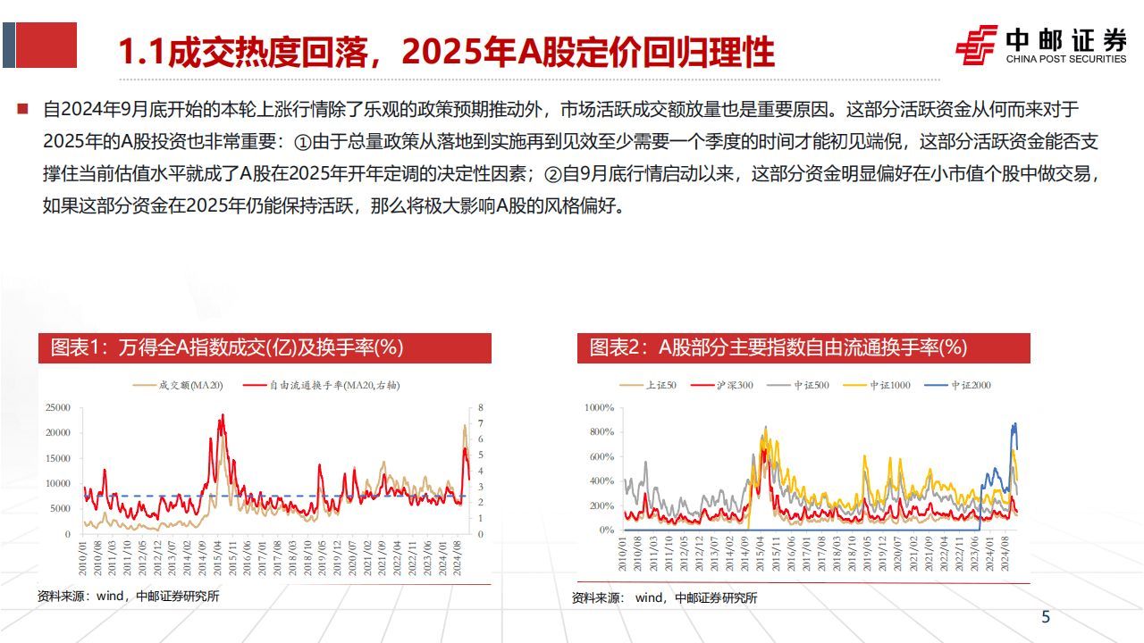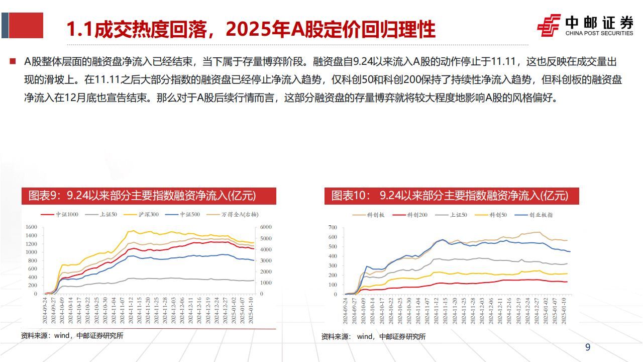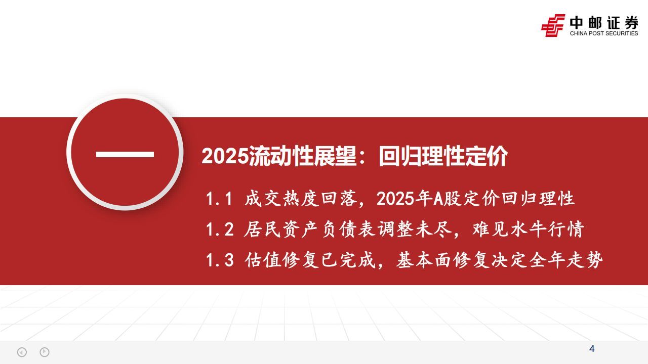 在流动性方面,2025 年 A 股成交热度预计回落,定价回归理性。自 2024 年 9 月底上涨行情中,融资盘成为带动成交额放量的关键,不过当前 A 股整体已进入存量博弈阶段。居民资产负债表调整尚未完成,尽管居民有大量超额净存款,但因楼市回调等因素,资金入市意愿低,难以形成水牛行情。从估值角度看,整体已完成修复,后续走势取决于基本面。当前全 A 整体 PE_NTM 处于 2016 年以来 60%分位数,各宽基指数估值有差异。