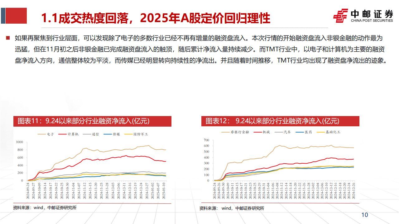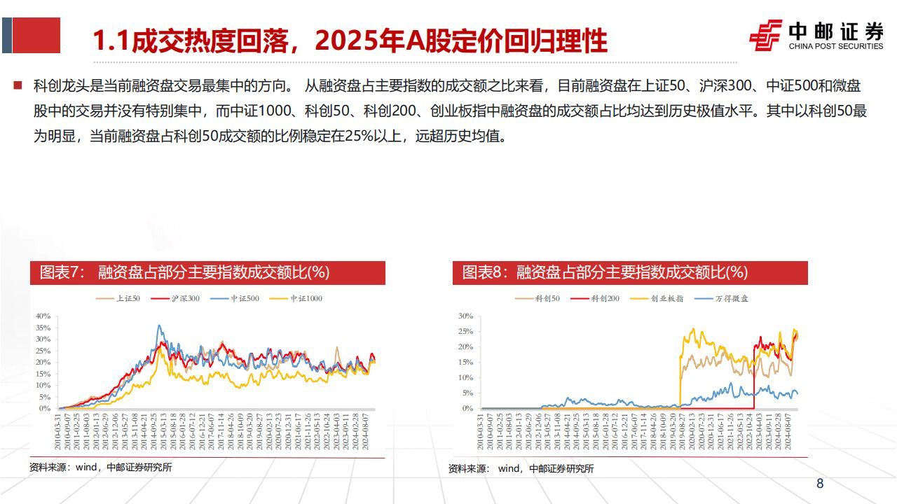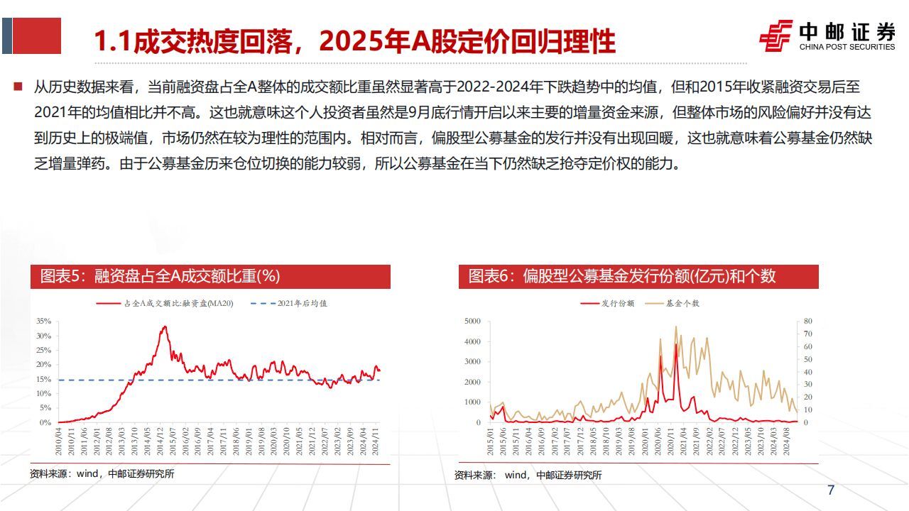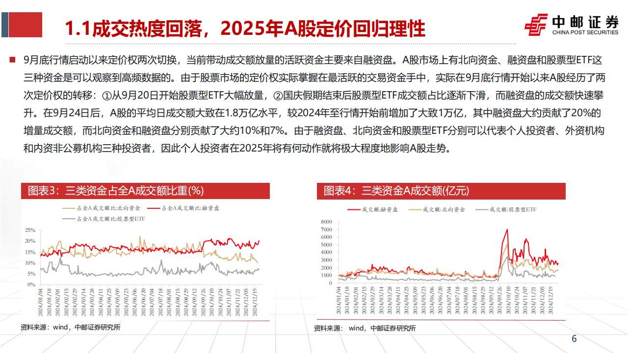 在流动性方面,2025 年 A 股成交热度预计回落,定价回归理性。自 2024 年 9 月底上涨行情中,融资盘成为带动成交额放量的关键,不过当前 A 股整体已进入存量博弈阶段。居民资产负债表调整尚未完成,尽管居民有大量超额净存款,但因楼市回调等因素,资金入市意愿低,难以形成水牛行情。从估值角度看,整体已完成修复,后续走势取决于基本面。当前全 A 整体 PE_NTM 处于 2016 年以来 60%分位数,各宽基指数估值有差异。