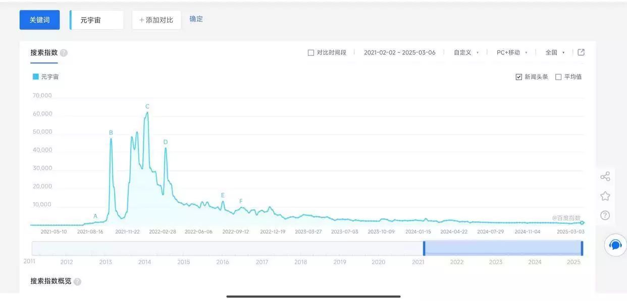 2021年,沙盒游戏平台Roblox在纽交所上市,首日市值突破400亿美元,其提到的元宇宙概念爆火,引得全球无数企业争相入场,互联网巨头Facebook甚至更名为「Meta」,以表明进军元宇宙的决心。然而元宇宙泡沫破灭的速度超乎想象,到了2022年,关于元宇宙的新消息就少了许多,如今更是少有人提及。