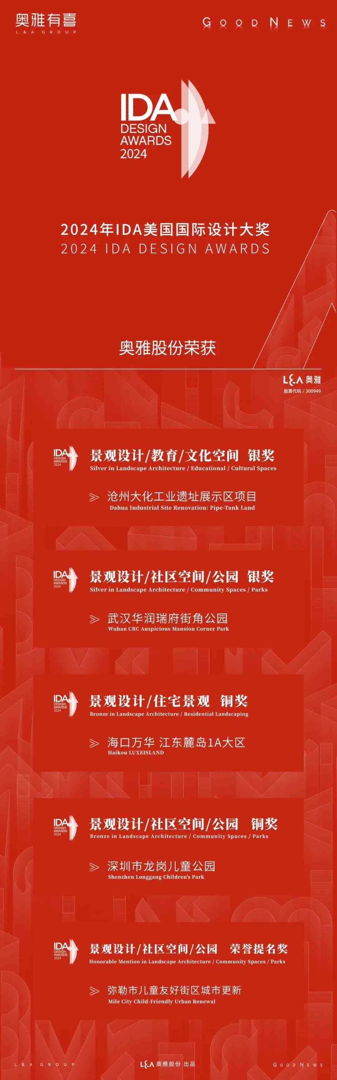 2024美国IDA国际设计大奖(International Design Awards,以下简称IDA)获奖名单正式揭晓。奥雅股份(股票代码:300949)作品凭借在园林和景观工程领域的杰出表现脱颖而出。其中,沧州大化工业遗址展示区项目、武汉华润瑞府街角公园获银奖,海口万华江东麓岛1A大区、深圳市龙岗儿童公园获铜奖,云南弥勒市儿童友好街区城市更新获荣誉提名奖。