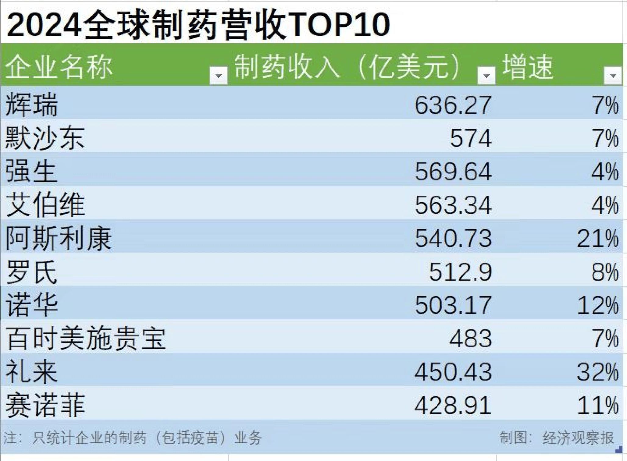 美国《制药经理人》(PharmExec)杂志2024年发布的最新全球制药企业TOP50榜单是制药行业公认的排行榜,该榜单主要依据各大药企的处方药销售收入进行排名。