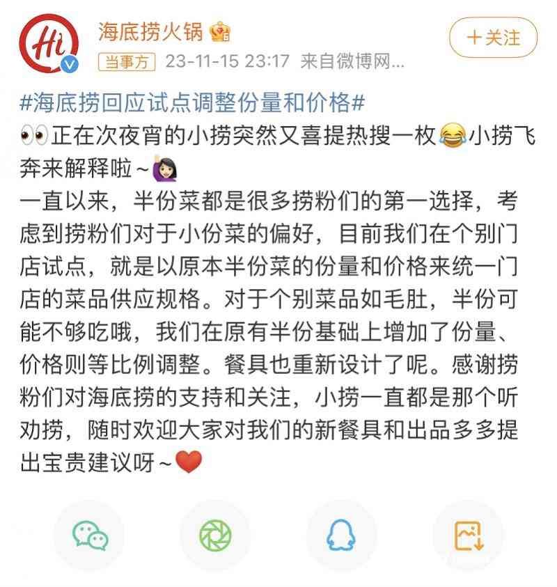 对此,11月15日晚间,海底捞通过官方微博回应称,“一直以来,半份菜都是很多捞粉(即海底捞粉丝)们的第一选择,考虑到捞粉们对于小份菜的偏好,目前我们在个别门店试点,就是以原本半份菜的份量和价格来统一门店的菜品供应规格。”
