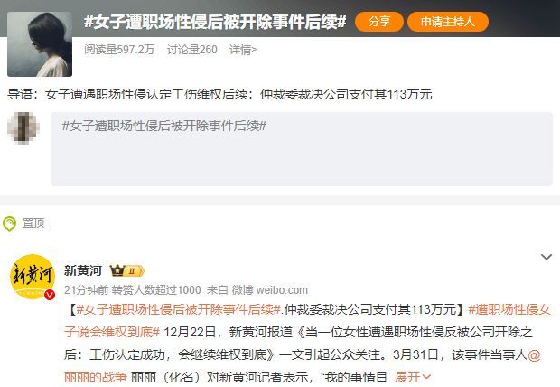 今天,“女子遭职场性侵后被开除事件后续”话题冲上微博热搜。