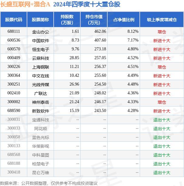 长盛互联网+混合A为混合型-灵活基金,根据最新一期基金季报显示,该基金资产配置:股票占净值比82.76%,无债券类资产,现金占净值比8.59%。基金十大重仓股如下: