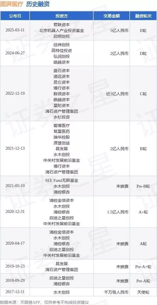 证券之星消息,根据天眼查APP于3月11日公布的信息整理,图湃(北京)医疗科技有限公司E轮融资,融资额5亿人民币,参与投资的机构包括君联资本,北京机器人产业投资基金,启明创投。