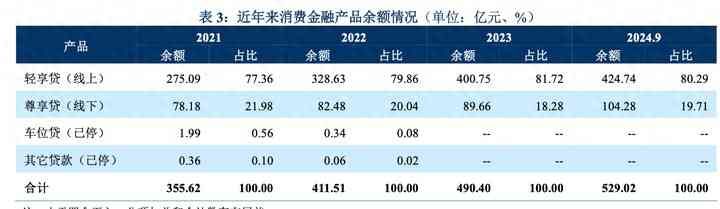 杭银消金拥有线上轻享贷、线下尊享贷两大产品体系。截至2024年9月末,杭银消金轻享贷业务余额为424.74亿元,占比为80.29%;尊享贷业务余额为104.28亿元,占比为19.71%。