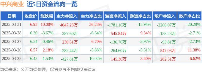 证券之星消息,截至2025年3月31日收盘,中兴商业(000715)报收于6.93元,上涨10.0%,涨停,换手率3.95%,成交量16.37万手,成交额1.12亿元。