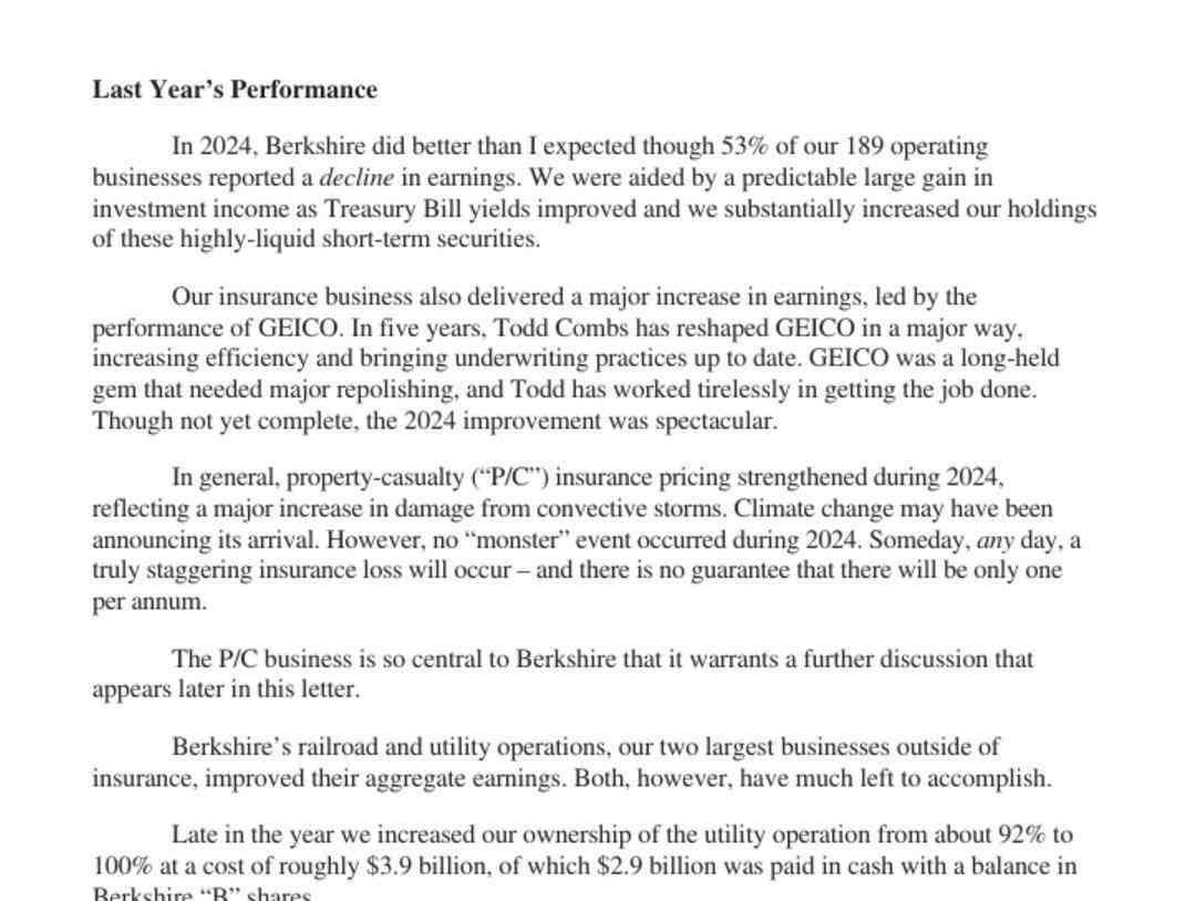 巴菲特在信中特别提到,伯克希尔在2024年的表现超出了预期,尽管旗下189家运营企业中有53%的企业报告收益下滑。然而,由于美国国债收益率的提高,伯克希尔大幅增加了对高流动性短期证券的持有量,从而实现了投资收益的大幅增长。