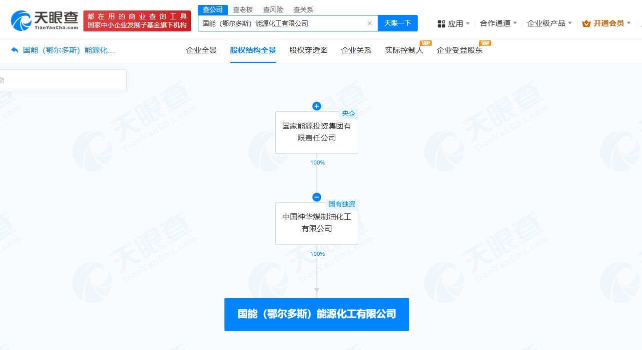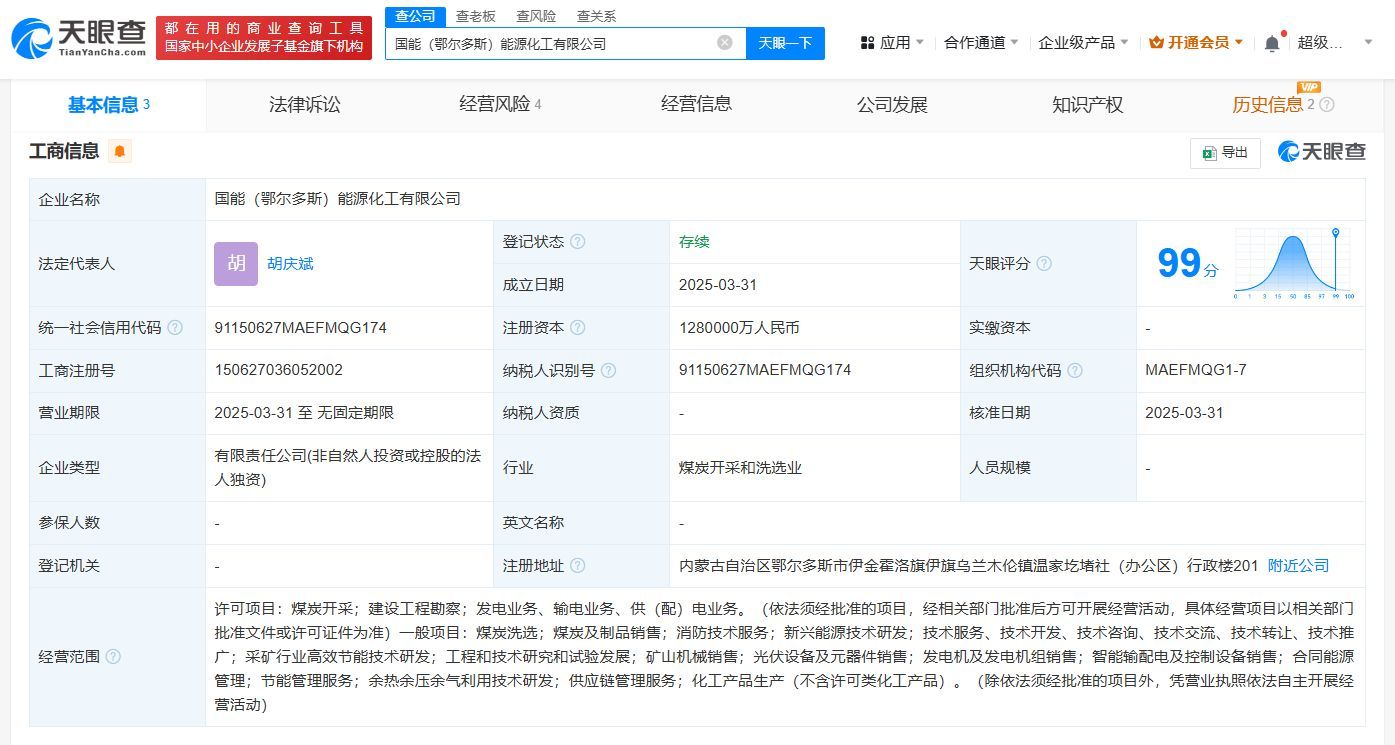 天眼查App显示,近日,国能(鄂尔多斯)能源化工有限公司成立,法定代表人为胡庆斌,注册资本128亿人民币,经营范围包括煤炭开采、建设工程勘察、采矿行业高效节能技术研发、工程和技术研究和试验发展、矿山机械销售等。股权全景穿透图显示,该公司由中国神华煤制油化工有限公司全资持股,后者为国家能源投资集团有限责任公司全资子公司。