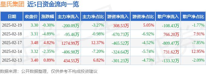 皇氏集团(002329)2月19日主力资金净卖出200.09万元