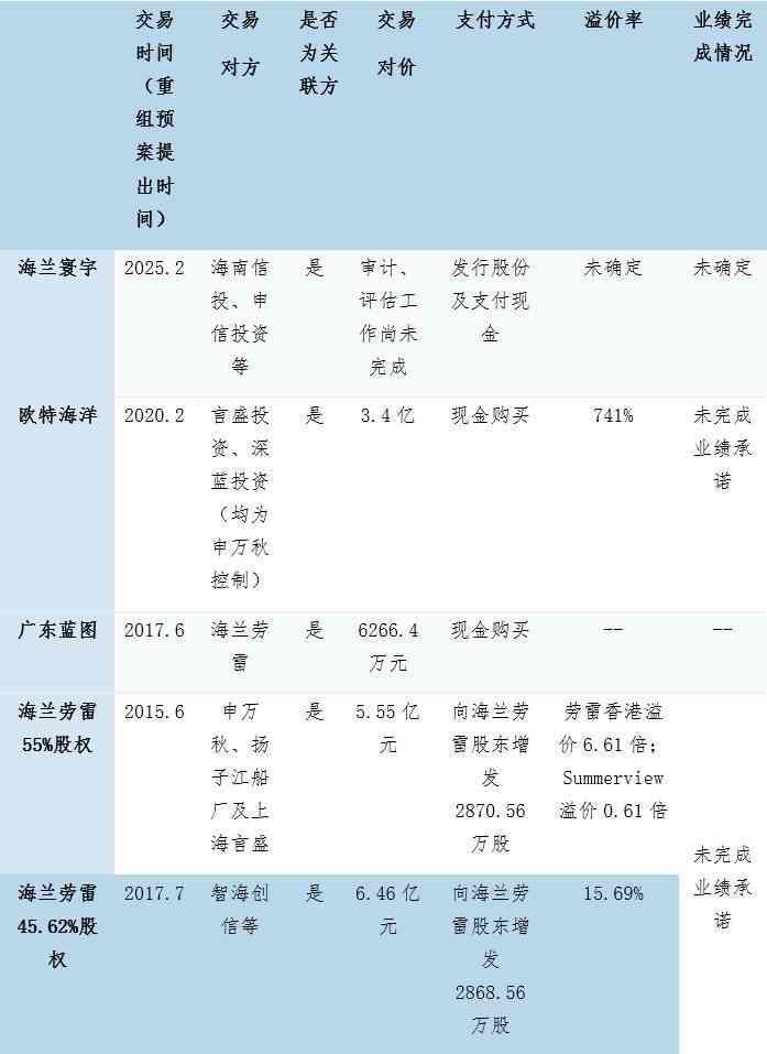 这不是海兰信第一次购买实控人旗下资产。2020年2月,海兰信以3.4亿元现金收购申万秋控制的欧特海洋100%股权,收购溢价超7倍。2015年,海兰信作价5.5亿元收购的海兰劳雷也是申万秋旗下产业。