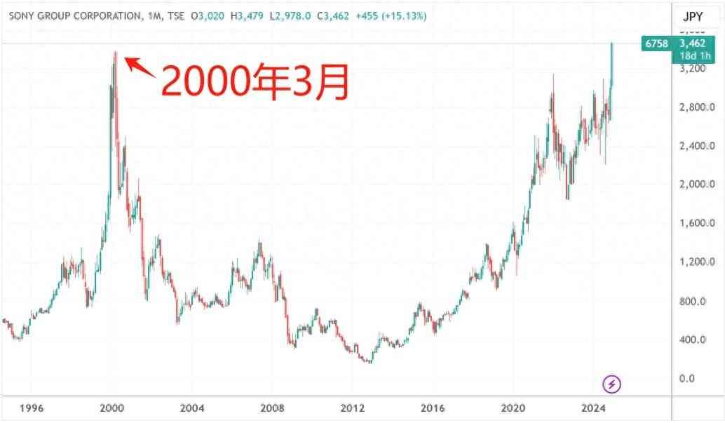 值得一提的是,索尼在这一轮上涨中突破的前高,已经要追溯到24年前的2000年3月。在此期间,索尼市值一度蒸发95.37%(2012年12月),接下来又通过猛涨22倍重回巅峰。