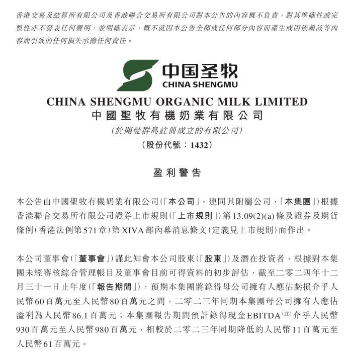 2月14日,中国圣牧有机奶业有限公司 (01432.HK)(以下简称为中国圣牧)发布盈利警告,公告中显示,截至2024年12月31日止年度(报告期间),预期中国圣牧将录得母公司拥有人应占亏损介乎人民币60百万元至人民币80百万元之间,2023年同期中国圣牧母公司拥有人应占溢利为人民币86.1百万元;报告期间预计录得现金EBITDA(注)介乎人民币930百万元至人民币980百万元,相较于2023年同期降低约人民币11百万元至人民币61百万元。