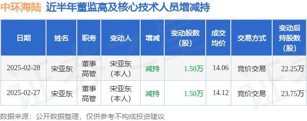 中环海陆:2月28日高管宋亚东减持股份合计1.5万股