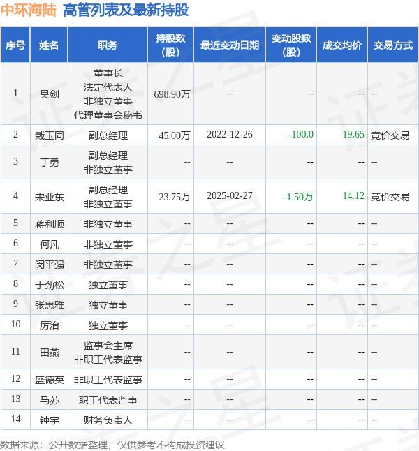中环海陆的高管列表及最新持股情况如下: