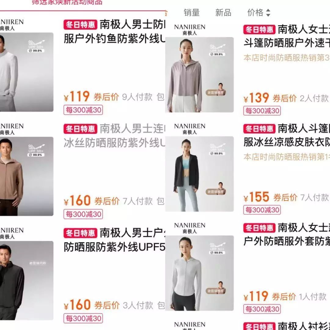 上半年,南极人主推的服饰为谢霆锋同款男士防晒服,天猫官方旗舰店一共上新3款商品售价为119元和160元。