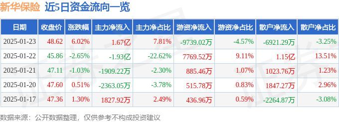 新华保险(601336)1月23日主力资金净买入1.67亿元