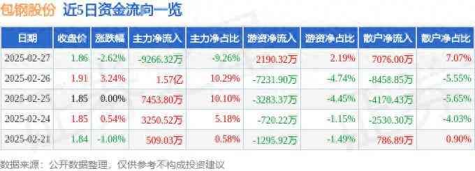 证券之星消息,截至2025年2月27日收盘,包钢股份(600010)报收于1.86元,下跌2.62%,换手率1.7%,成交量535.4万手,成交额10.0亿元。