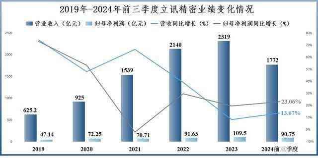 2019-2023年立讯精密营收从625.2亿元增长至2319亿元,净利润从47.14亿元增长到109.5亿元,年复合增速均超过20%。