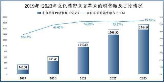 2019-2023年公司来自苹果的销售额从346.51亿元增长到1744.9亿元,年复合增速接近50%。