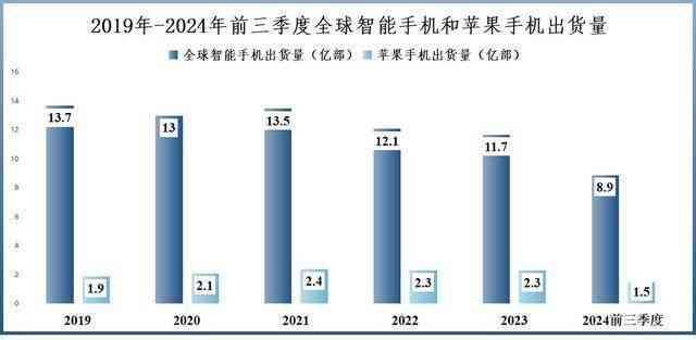 2021-2023年全球智能手机出货量从13.5亿部降低到11.7亿部,但苹果手机的出货量只降了0.1亿部,受到的影响很小。