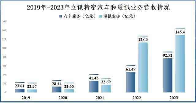 2019-2023年公司汽车业务从23.61亿元持续上升到92.52亿元,通讯业务更是从22.37亿元增长到145.4亿元,帮助公司顺利穿越周期。