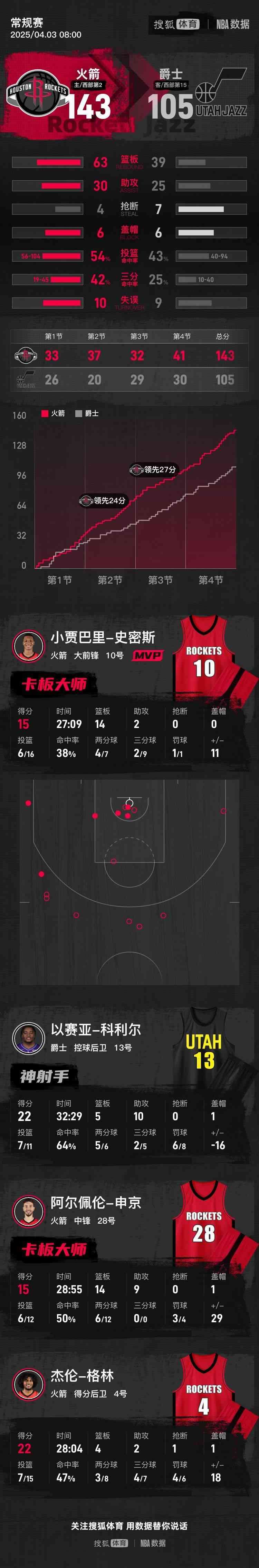 第四节,火箭的手感再次出现波动,开局时双方分差缩小至23分。然而,随着比赛的进行,火箭逐渐找回节奏,再次通过一波进攻展现出强大的火力,领先优势扩大至41分。尽管爵士在小节后段试图追赶,火箭的表现依然令人惊叹。本节中的谢泼德表现尤为突出,单节砍下15分,其中包括5记三分。比赛最终以火箭143-105取胜结束。