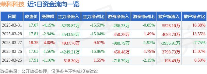 证券之星消息,截至2025年3月31日收盘,荣科科技(300290)报收于17.07元,下跌4.15%,换手率3.09%,成交量19.74万手,成交额3.37亿元。