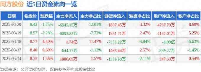 证券之星消息,截至2025年3月20日收盘,同方股份(600100)报收于8.42元,下跌1.75%,换手率1.92%,成交量64.28万手,成交额5.45亿元。