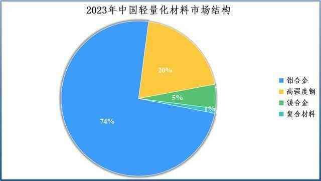 2023年,国内汽车轻量化材料市场规模大约为4226亿元。其中,汽车用铝合金规模高达3137.66亿元,占比达74%,远高于高强度钢、镁合金等。