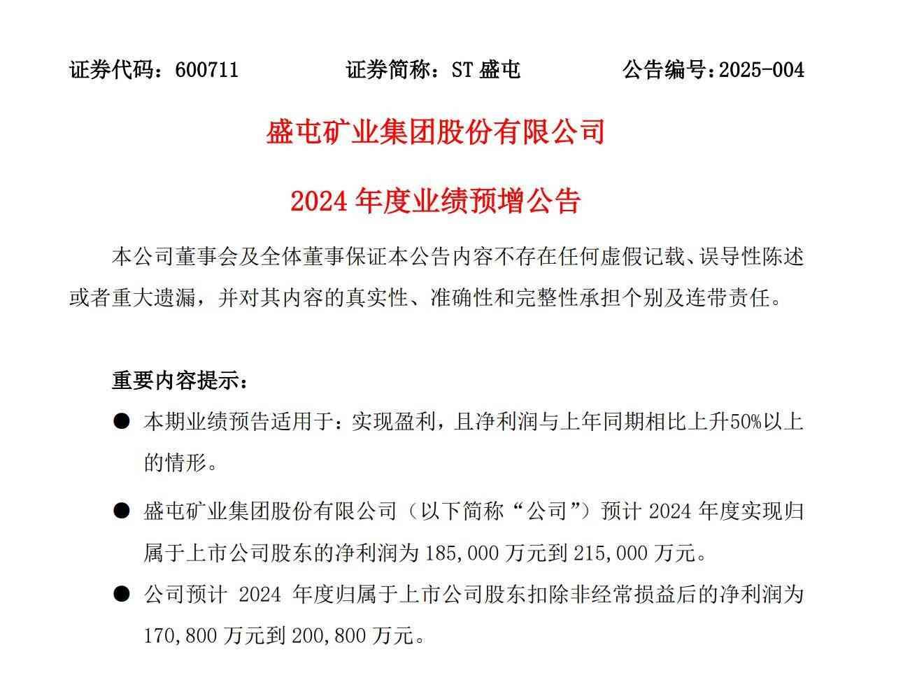 2025年1月23日,盛屯矿业600711披露《2024年度业绩预增公告》,公司预计2024年度实现归属于上市公司股东的净利润为185,000万元到215,000万元。