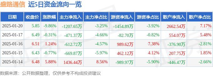 盛路通信(002446)1月20日主力资金净卖出1207.65万元