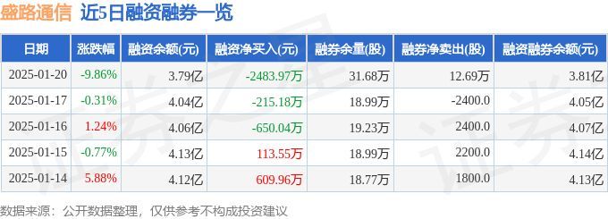 证券之星消息,截至2025年1月20日收盘,盛路通信(002446)报收于5.85元,下跌9.86%,换手率7.47%,成交量63.33万手,成交额3.71亿元。
