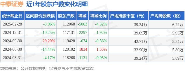 从股价来看,2024年12月31日至2025年2月28日,中泰证券区间跌幅为3.96%,在此期间股东户数减少5063.0户,减幅为4.32%。