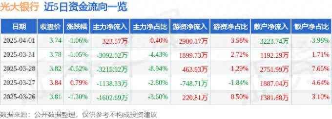 证券之星消息,截至2025年4月1日收盘,光大银行(601818)报收于3.74元,下跌1.06%,换手率0.47%,成交量216.93万手,成交额8.09亿元。