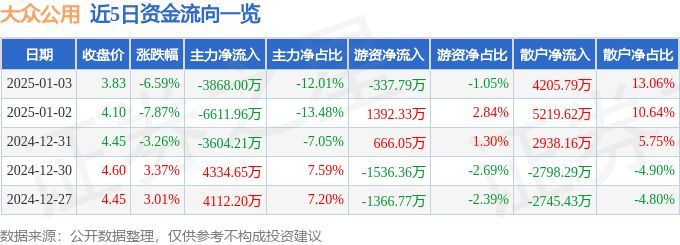 大众公用(600635)1月3日主力资金净卖出3868.00万元