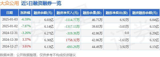 大众公用融资融券信息显示,融资方面,当日融资买入2634.09万元,融资偿还3748.86万元,融资净偿还1114.77万元。融券方面,融券卖出10.63万股,融券偿还3.71万股,融券余量46.75万股,融券余额179.05万元。融资融券余额6.04亿元。
