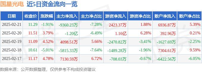 国星光电(002449)2月21日主力资金净卖出9360.23万元
